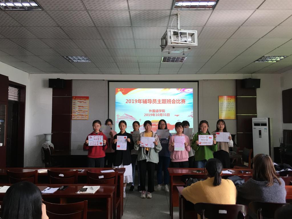 为深入学习贯彻习近平新时代中国特色社会主义思想和党的十九大精神,全面贯彻落实全国教育大会、全国高校思想政治工作会议、学校思想政治理论课教师座谈会精神,进一步提高新时代外国语学院辅导员的工作能力与育人水平,提升大学生思想政治教育质量,10月31日下午,外国语学院在会议室举行了辅导员精彩主题班会比赛。