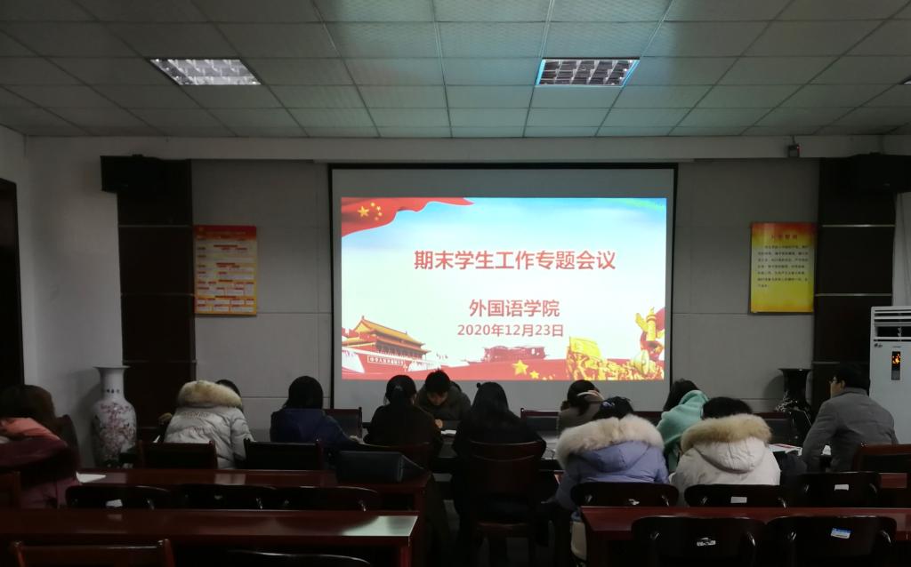 12月23日下午,外国语学院在会议室举行全体辅导员会议,研究部署期末学生工作。会议由外国语学院党委副书记刘军主持。