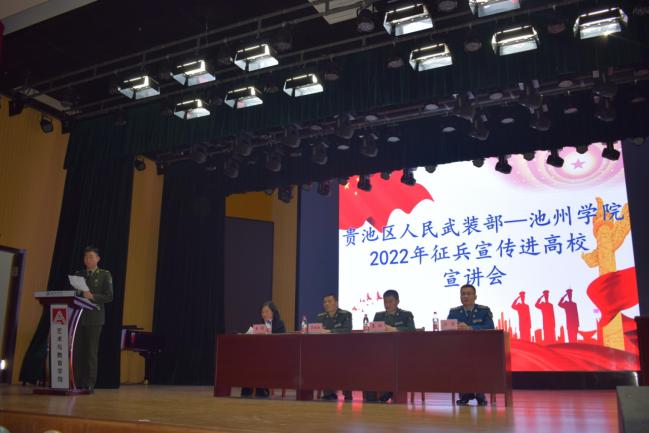 12月22日下午,买球官网在音乐厅举行2022年征兵政策宣讲会。池州军分区动员处处长渠胜红、贵池区人武部政委冯涛、部长夏阳出席了宣讲会。各二级学院毕业班辅导员、部分毕业生代表以及其他年级有入伍意向的学生代表参加了会议。