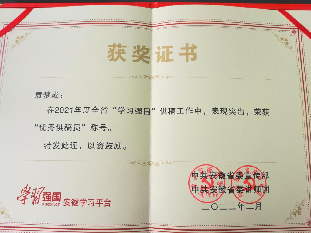 近日,中共安徽省委宣传部、中共安徽省委讲师团对2021年度全省“学习强国”学习平台工作中涌现的先进个人进行表彰,买球官网党委宣传部袁梦成老师获评“优秀供稿员”。买球官网是全省高校中唯一 一个获得表彰的高校。