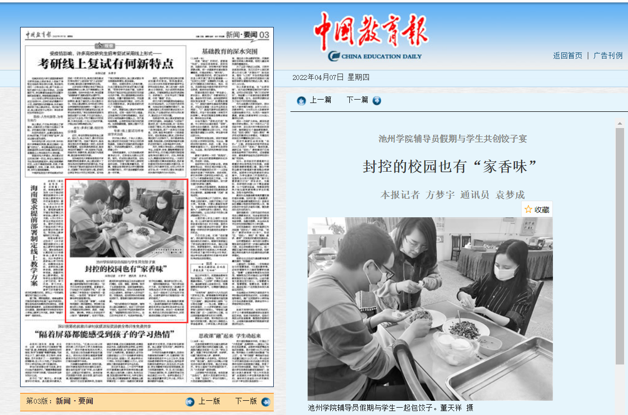 4月7日,中国教育报以《外围买球app十大平台辅导员假期与学生共创饺子宴,封控的校园也有“家香味”》为题,对买球官网辅导员假期为学生包暖心饺子活动进行报道。
