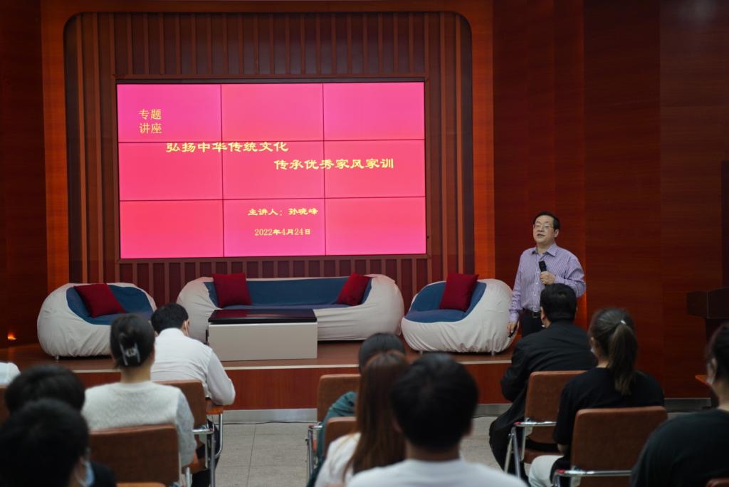 4月24日,外围买球app十大平台大学生成长沙龙“青春大讲堂”2022年第三期(总第二十八期)在大学生活动中心举行。校党委书记孙晓峰以“弘扬中华传统文化 传承优秀家风家训”为主题,为现场师生带来一场内容丰富、思想深刻的家风教育专题讲座。