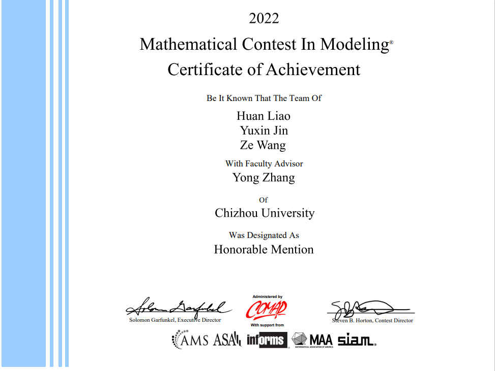 近日,2022年美国大学生数学建模竞赛成绩揭晓,买球官网四支参赛队获得H奖1项、S奖3项的成绩。其中,由大数据与人工智能学院王泽团队(指导教师:张永)获得了H奖。