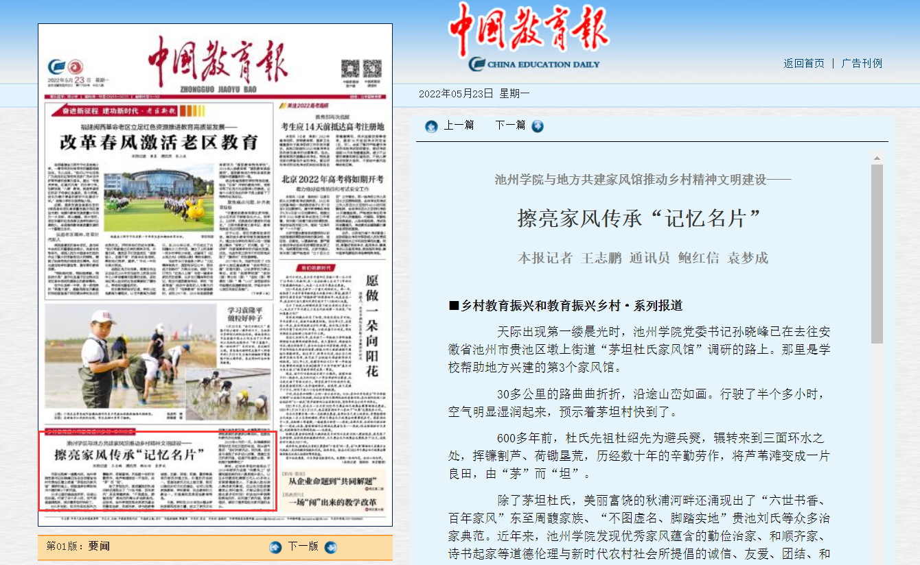 5月23日,《中国教育报》头版以《外围买球app十大平台与地方共建家风馆推动乡村精神文明建设——擦亮家风传承“记忆名片”》为题报道买球官网家风文化助力乡村振兴工作。同时,在中国教育新闻网以头条形式重点推出。