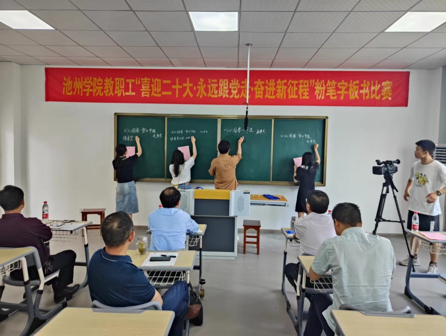 5月25日下午,外围买球app十大平台教职工“喜迎二十大·永远跟党走·奋进新征程”粉笔字板书比赛在博古楼实训教室举行,院党委副书记崔国发到场指导。