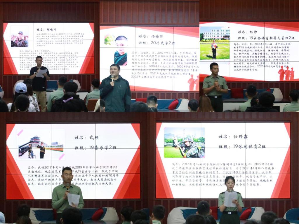 机电工程学院郑啸川、艺术与教育学院武硕、旅游与历史文化学院汤皓然,体育学院任玮鑫和纪帅五位退伍大学生分别分享了成长心路历程。同时,他们号召同学们将小我融入大我,青春奉献祖国,到祖国最需要的地方,贡献出自己的青春力量,鼓励同学们一起积极投身实现中华民族伟大的复兴的中国梦中。