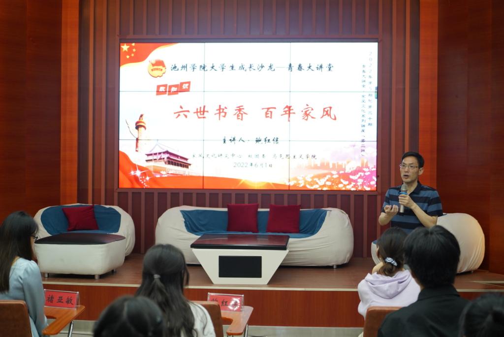 6月1日,外围买球app十大平台大学生成长沙龙“青春大讲堂”2022年第五期(总第三十期)在大学生活动中心举行。马克思主义学院副院长、家风中心副主任鲍红信博士以“六世书香 百年家风”为主题,为现场师生带来一场精彩生动的家风教育专题讲座。