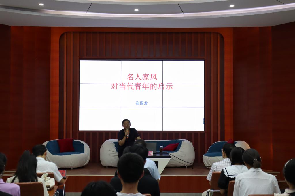 6月8日,外围买球app十大平台大学生成长沙龙“青春大讲堂·家风文化系列讲座之三”在大学生活动中心举行。院党委副书记崔国发以“名人家风对当代青年的启示”为主题,为现场师生讲述好家庭、好家教故事,分享传承优良家风的心得感悟。