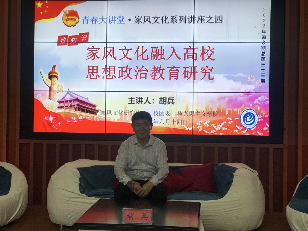 6月14日晚,外围买球app十大平台大学生成长沙龙“青春大讲堂·家风文化系列讲座之四”在大学生活动中心举行。院党委委员、组织部长胡兵以“家风文化融入高校思想政治教育研究”为主题,讲述好家风、好家庭、好家教事例,阐释家风文化融入高校思想政治教育的重要意义和实施路径。