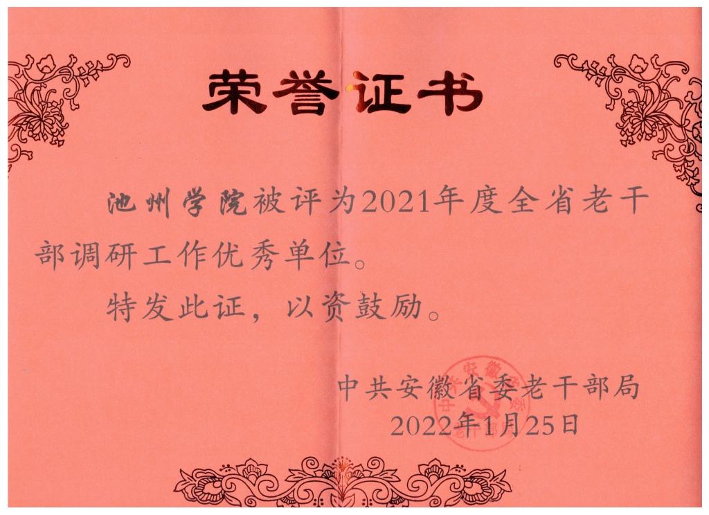 根据中共安徽省委老干部局《关于确定2021年度全省老干部调研工作优秀单位的通知》(皖老通字[2022]2号)和《关于2021年度全省优秀调研成果通报和2022年调研工作的通知》(皖老通字[2022]11号)等文件,买球官网荣获2021年度全省老干部调研工作优秀单位,离退休工作处潘桂莲同志《推进新时代老干部党建工作的思考与探索——外围买球app十大平台党建引领推动老干部工作高质量发展》的调研报告荣获2021年度全省老干部工作优秀调研成果。退休干部徐健同志创作的书法作品“虎踞龙盘今胜昔,天翻地覆慨而慷”入选全省老干部系统庆祝中国共产党成立100周年“伟大的旗帜”书画展,作品入编《伟大的旗帜·全省老干部系统庆祝中国共产党成立100周年书画作品集》。