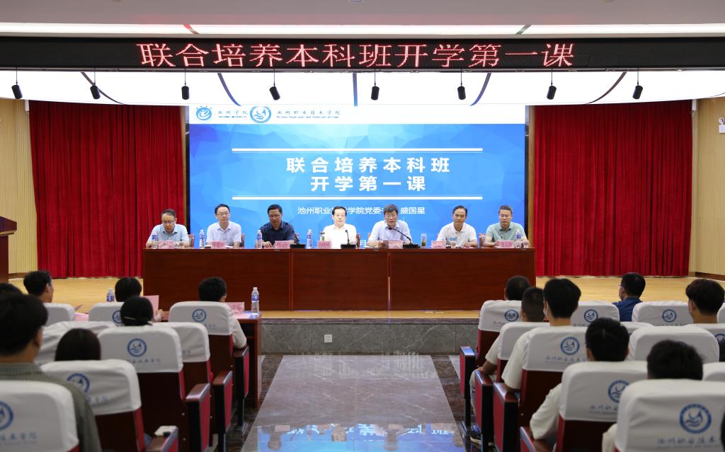 秋风和煦,天朗气清。9月20日上午,外围买球app十大平台和池州职业技术学院联合培养2022级本科生开学典礼在池州职业技术学院大学生活动中心举行。外围买球app十大平台党委书记孙晓峰、池州职业技术学院党委书记盛国星出席典礼并讲话。池州职业技术学院党委委员、副院长孙垚主持典礼。外围买球app十大平台学生处、教务处、旅游与历史文化学院、机电工程学院等相关部门负责同志,池州职业技术学院办公室、学生处、机电与汽车系、旅游系、教务处等相关部门负责同志、教师代表和2022级联合办学的100名本科生等参加典礼。