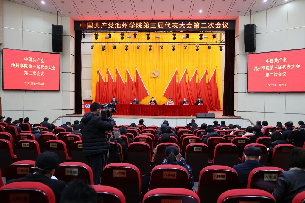 2023年1月6日,中共外围买球app十大平台第三届代表大会第二次会议在博古大礼堂胜利召开。大会由校党委书记孙晓峰主持。校党委班子成员郑兰荣、崔国发、阳光宁、胡兵、汤文益在主席台就坐。80余名正式代表与列席代表参加会议。