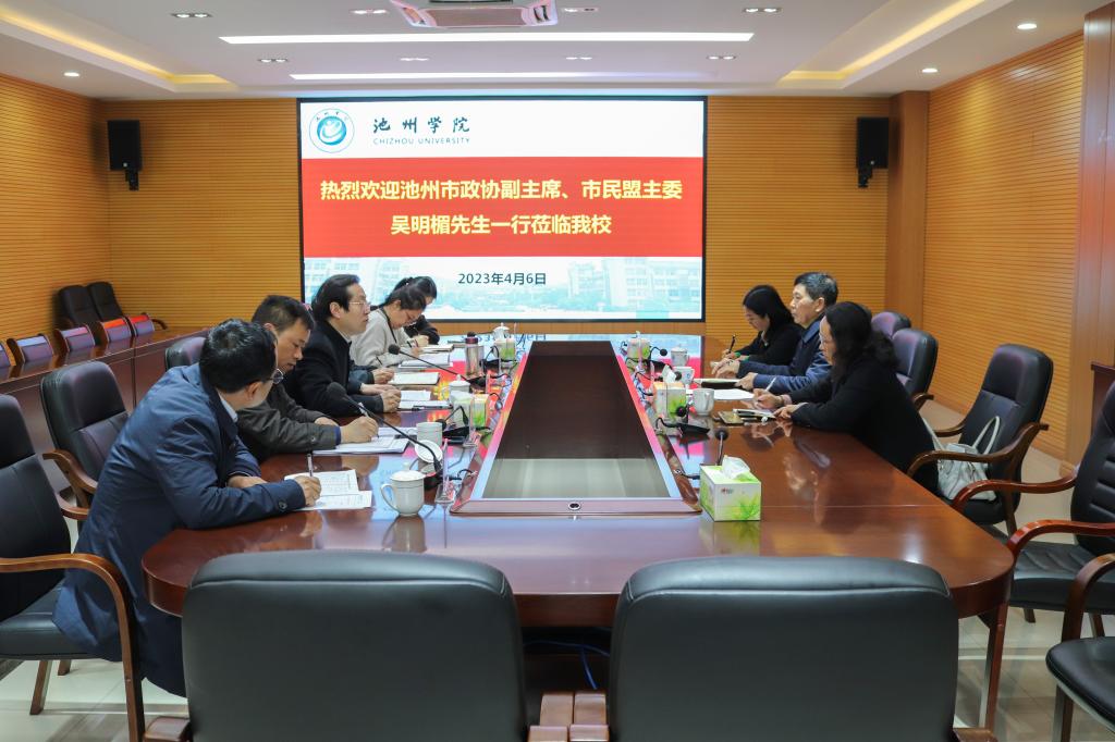 4月6日上午,池州市政协副主席、池州民盟主委吴明楣来买球官网走访调研。院党委书记孙晓峰、副书记崔国发热情接待了吴明楣一行。双方就民盟外围买球app十大平台支部组织发展和如何发挥支部人才优势进行了座谈交流。池州民盟副主委汪小玲参加座谈。