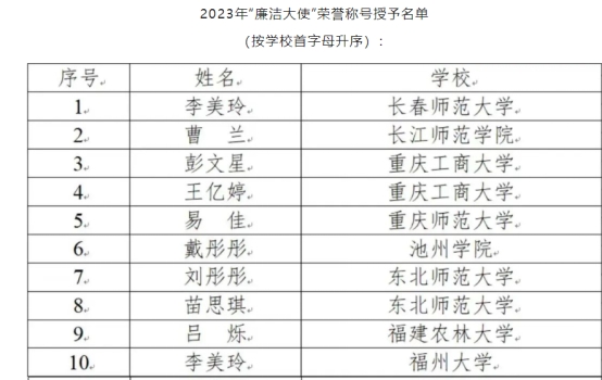 近日,由中国管理现代化研究会廉政分会、全国大学生廉洁社团网络、东北师范大学政法学院联合主办的2023年廉洁大使评选活动结果揭晓。买球官网大学生廉洁协会副会长、2021级汉语言文学(师范)2班戴彤彤同学被评为2023年全国“廉洁大使”。据悉,本年度全国范围内共评选出“廉洁大使”40名。