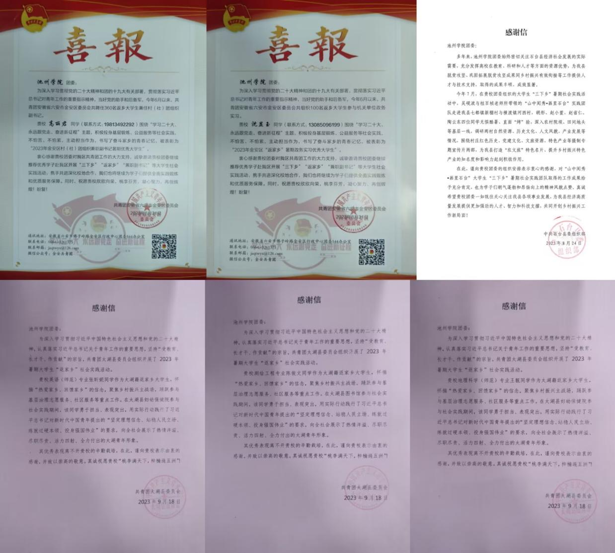 近日,学校陆续收到来自石台县委组织部、六安市金安区团委、太湖县团委等的多封感谢信。信中对买球官网胡彤、沈显玉等9位同学在2023年暑假期间积极投身当地“三下乡”“返家乡”“兼职副书记”等大学生社会实践活动给与了高度评价,对买球官网师生助力乡村振兴、贡献青春力量表示了感谢,并对买球官网人才培养工作成效给予了充分肯定。