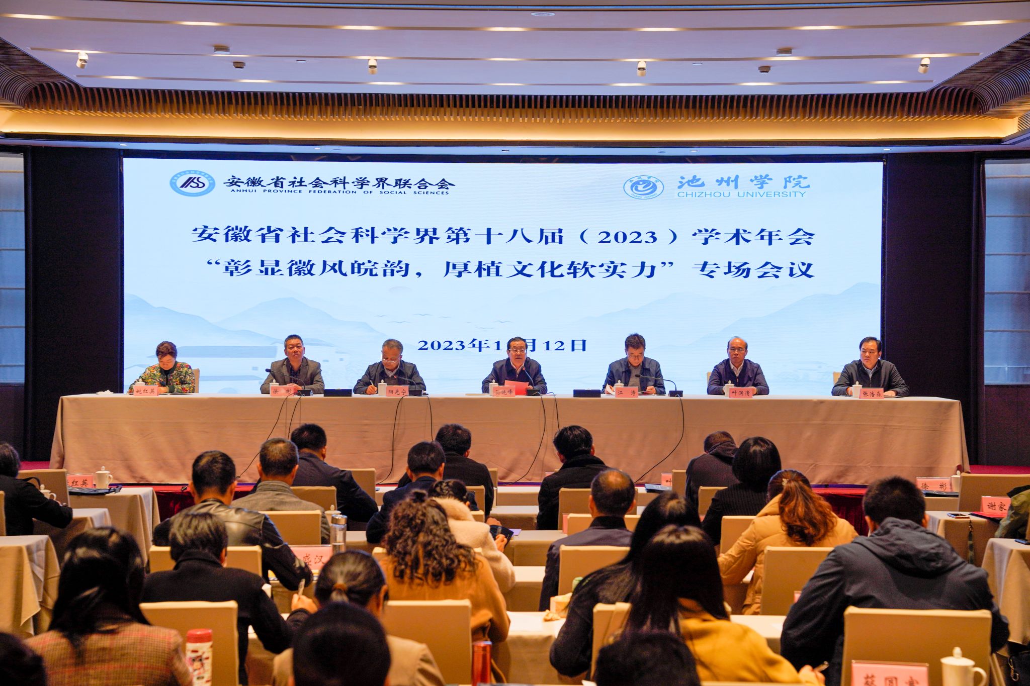 11月12日,由安徽省社科联主办、买球官网社科联承办的安徽省社科界第十八届(2023)学术年会“彰显徽风皖韵,厚植文化软实力”专场在买球官网召开。党委书记孙晓峰,安徽省社科联党组成员、副主席江涛出席会议并致辞。党委委员、副院长阳光宁主持开幕式。安徽省社科联学会工作处处长张浩淼,池州市委宣传部副部长、市社科联主席姚红英以及来自全省社科界百余名专家学者参加会议。