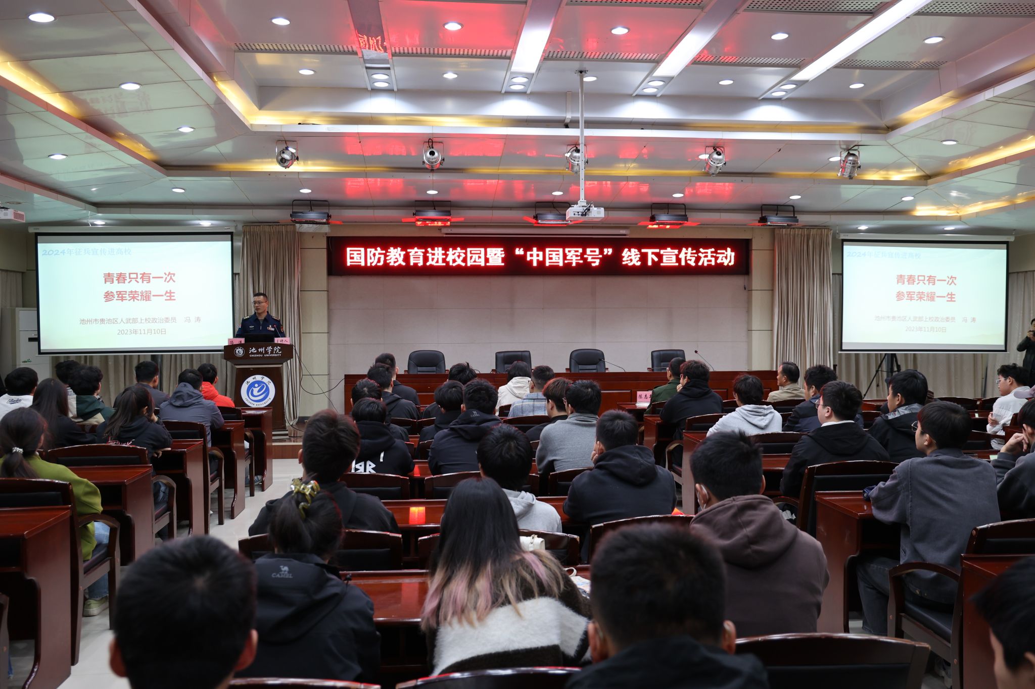 11月10日,学校开展国防教育暨征兵宣传活动。党委书记孙晓峰出席会议并讲话。党委委员、副院长阳光宁,池州军分区政委宋怀金,解放军新闻传播中心主任解学锋出席活动。