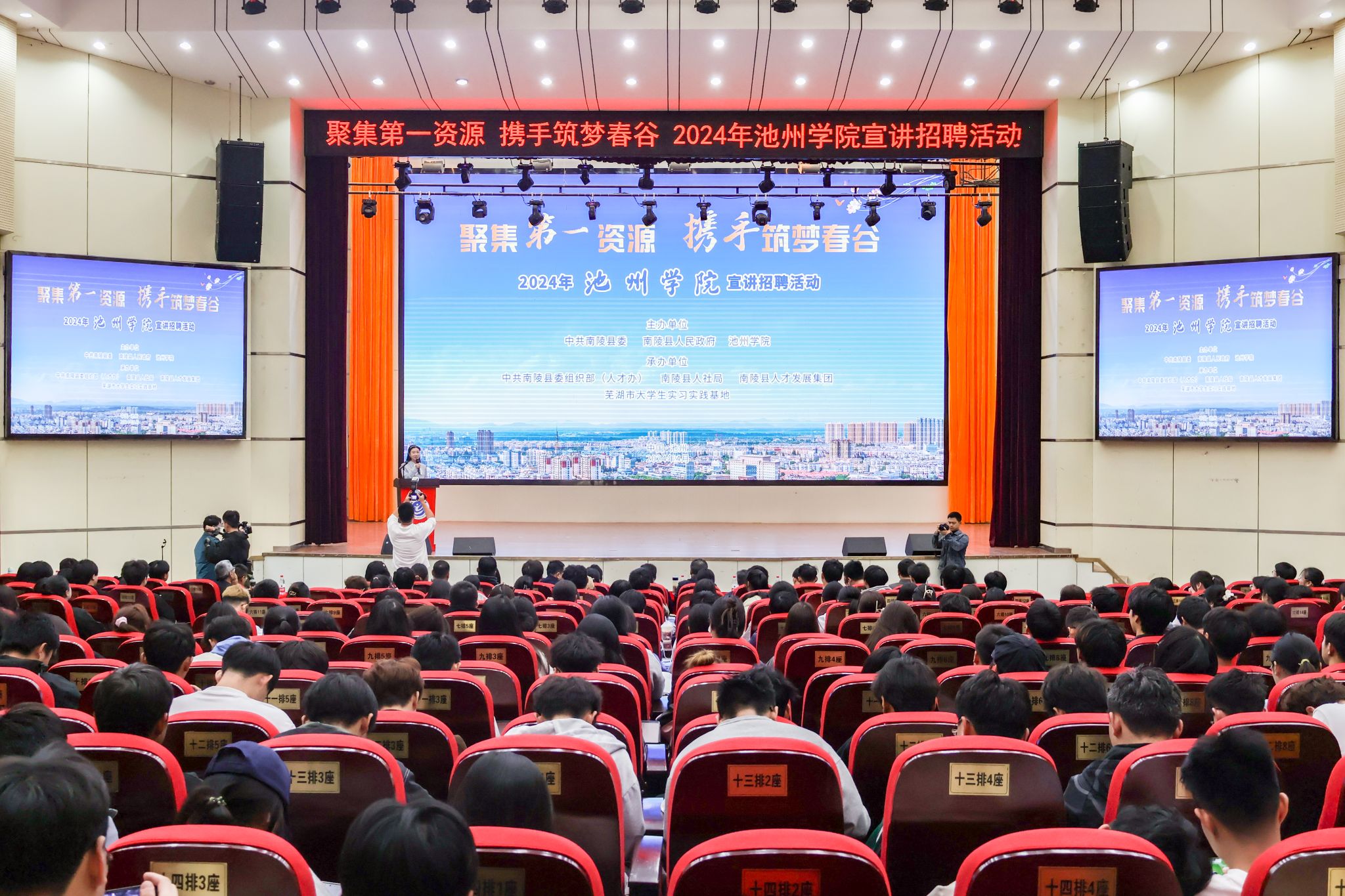 座谈会后,“聚焦第一资源,携手筑梦春谷”外围买球app十大平台专场宣讲招聘会在博古大礼堂举行。现场推介了南陵县情,宣介了芜湖市及南陵县人才政策,并为6名“南陵县校园青年引才大使”颁发了聘书。